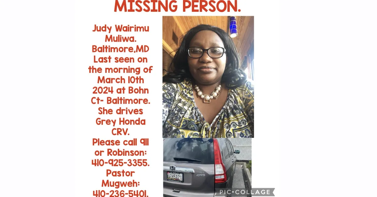 Judy Wairimu Mliwa, 46, was last seen on the morning of March 10, 2024 at Bohn Court in Baltimore. She drives a gray Honda CRV.