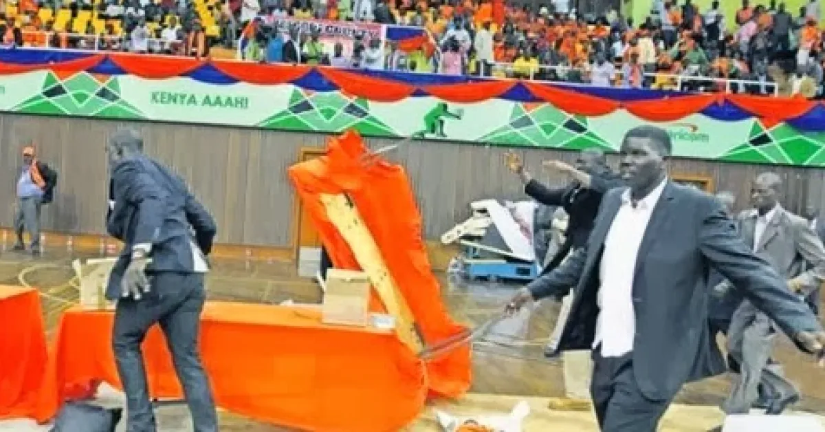 A similar group of men dressed in black stormed Kasarani Stadium in 2014 as ODM was conducting party elections, smashed ballot boxes, and destroyed voting papers. Those party elections had to be postponed to a later date.