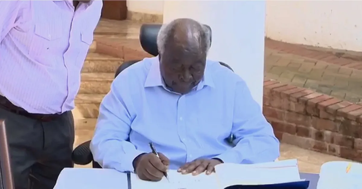 The photo was shared on Saturday, February 8th by The Standard, which reported that Kibaki, who served as Kenya’s third president, signed his predecessor Daniel Arap Moi’s condolence book.