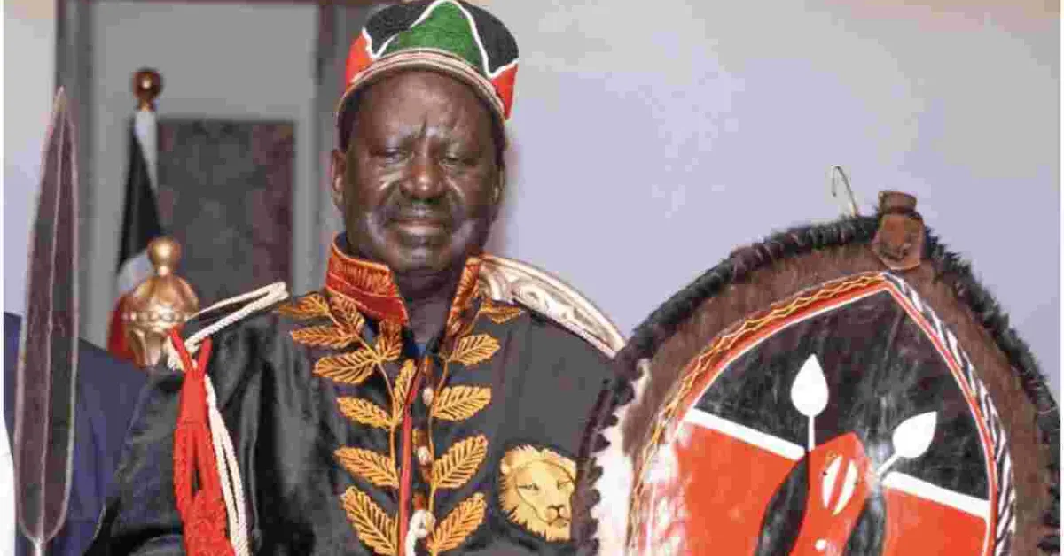 During the star-studded event, Raila sat on a gold and red ‘throne’ with a footstool. He wore a two-piece suit over a black animal skin cloak with the Kenyan flag’s colors on the heming, a Kufi cap, and a ceremonial spear.