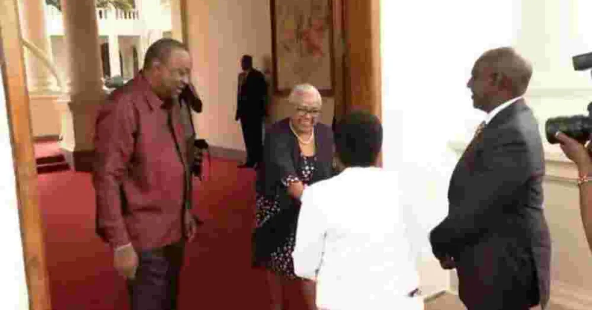 The president-elect and his wife Rachel Ruto arrived at State House, Nairobi at 4.00 pm on Monday, where they were received by Kenyatta and outgoing First Lady Margret Kenyatta at the main entrance.
