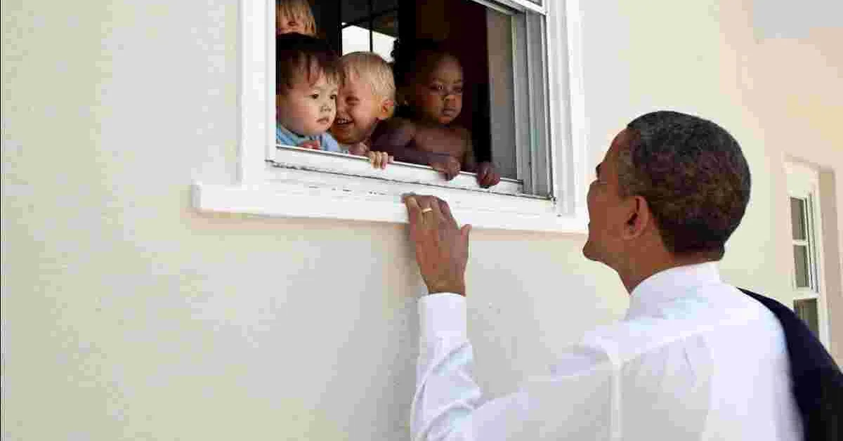 The tweet is accompanied by a photo of Obama taken at a day-care center in Bethesda, Maryland featuring a diverse group of children. The photo was taken in 2011 while Obama was still in office.